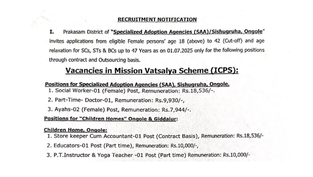 ఈ పోస్టులు ప్రకాశం జిల్లాలోని ఒంగోలు, గిద్దలూరులోని డిస్ట్రిక్ట్ చైల్డ్ ప్రొటెక్షన్ యూనిట్ మరియు వన్ స్టాప్ సెంటర్, శిశుగృహ, స్పెషలైజ్డ్ అడాప్షన్ ఏజెన్సీలో భర్తీ చేస్తున్నారు. ఈ పోస్టులకు ప్రకాశం జిల్లా అభ్యర్థులు మాత్రమే దరఖాస్తు చేసుకోవాలి.